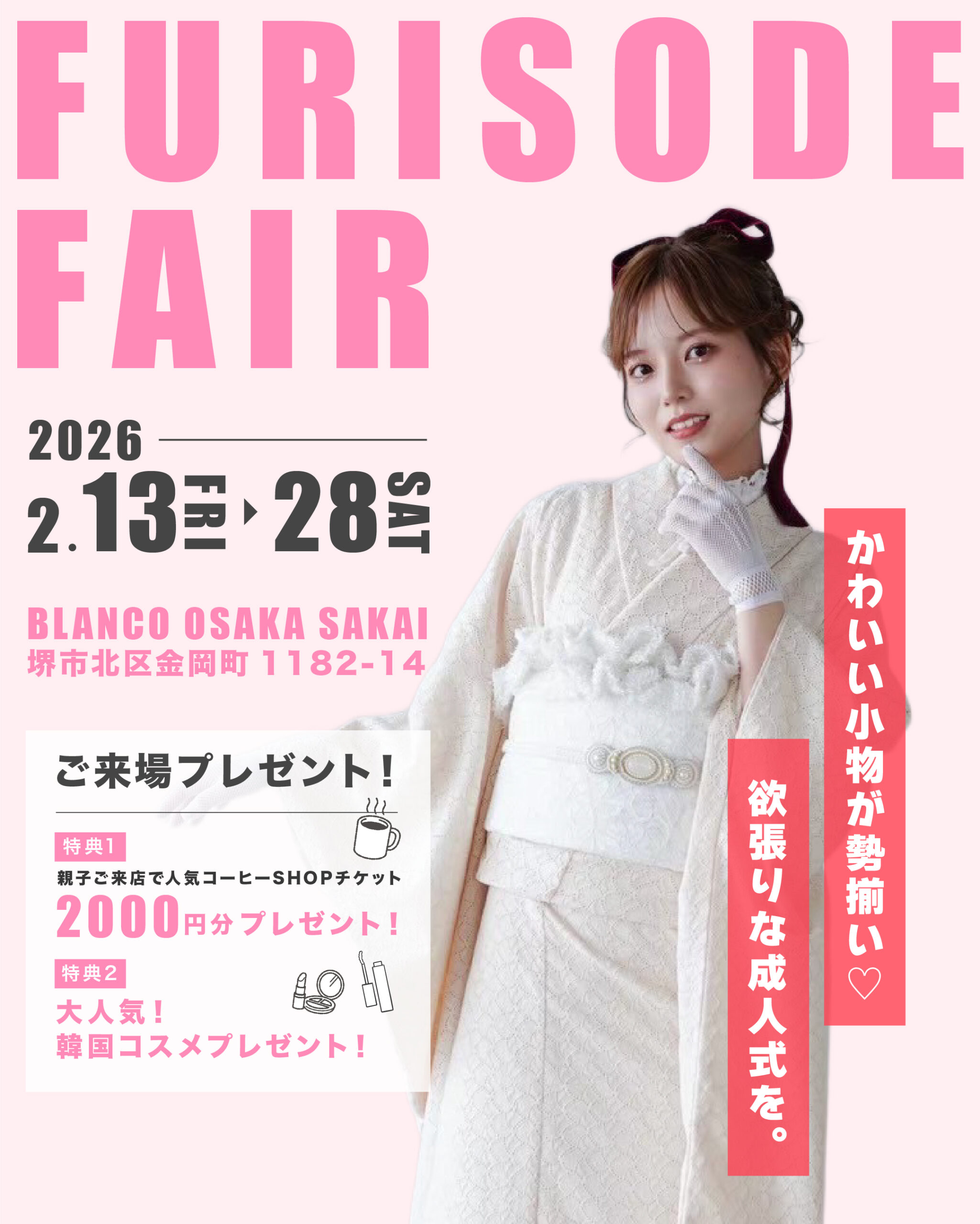 BLANCOは「かわいい♡やってみたい!もっとかわいくしたい」その20歳の“こだわり”を全部叶えるフォトスタジオ併設型振袖レンタル専門店です。振袖選びから小物コーディネート、前撮り、成人式当日までを一貫してサポートし、運命の一着と、忘れられない一日をつくります。トレンド感と品の良さを大切にしながら“自分史上一番かわいい私”に出会える場所。今ならファースト振袖が勢ぞろい♡